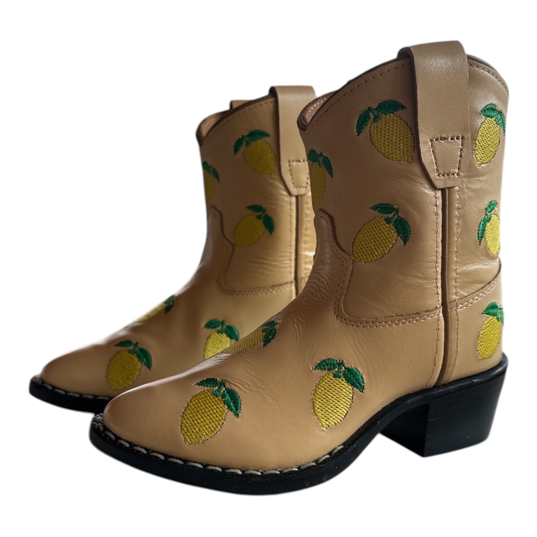 Step out in style with these playful beige cowboy boots, featuring vibrant lemon embroidery for a whimsical touch. Crafted from premium leather, they seamlessly blend classic Western vibes with a pop of fruity charm. Perfect for casual outings or a show-stopping festival look, these boots promise both comfort and fashion-forward flair. The sturdy heel adds just the right amount of lift, while the quirky design ensures you stand out from the crowd. Pair them with denim or a sundress for a fun, fresh ensemble. A must-have addition for those looking to inject some personality into their footwear collection.