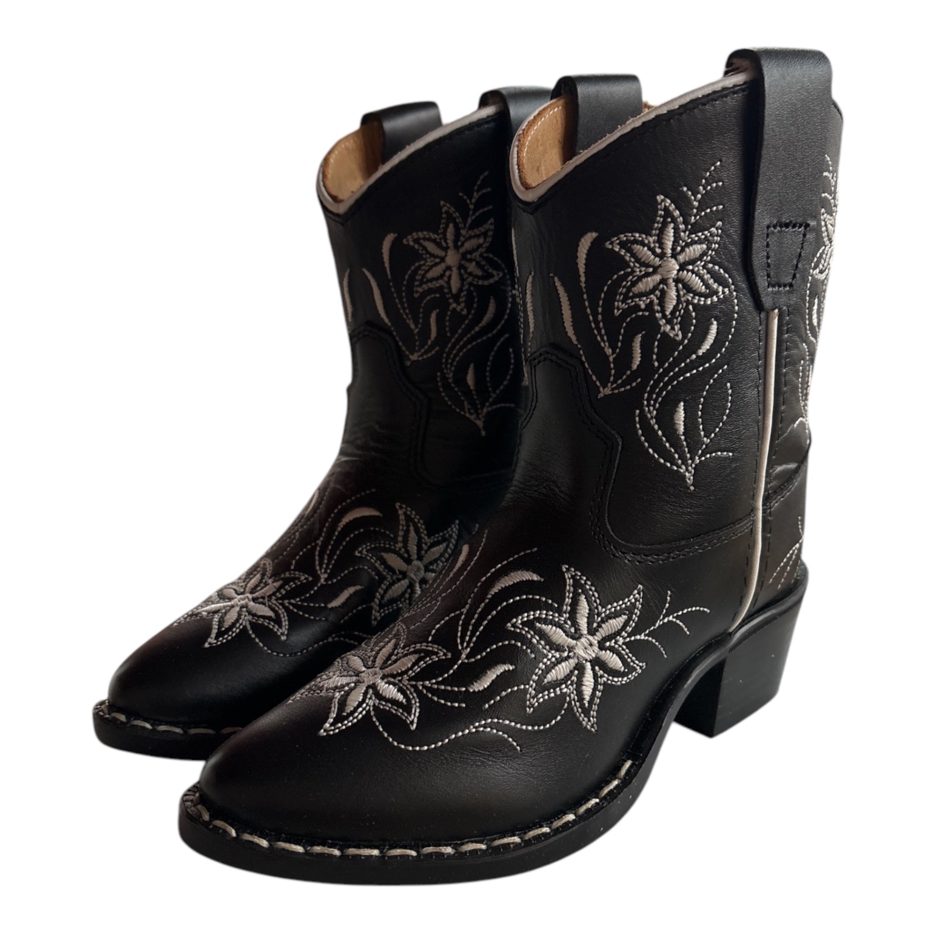 Step into timeless western style with these striking black leather cowboy boots. Adorned with delicate floral embroidery, they capture attention with their intricate detailing and classic silhouette. Perfect for both casual outings and themed events, they offer comfort and durability in every stride. The sleek black hue pairs effortlessly with any outfit, making them versatile enough to dress up or down. Designed for the modern cowboy or cowgirl, these boots add a touch of elegance and rugged charm to your collection. Ideal for anyone looking to make a fashion statement while staying true to western roots.