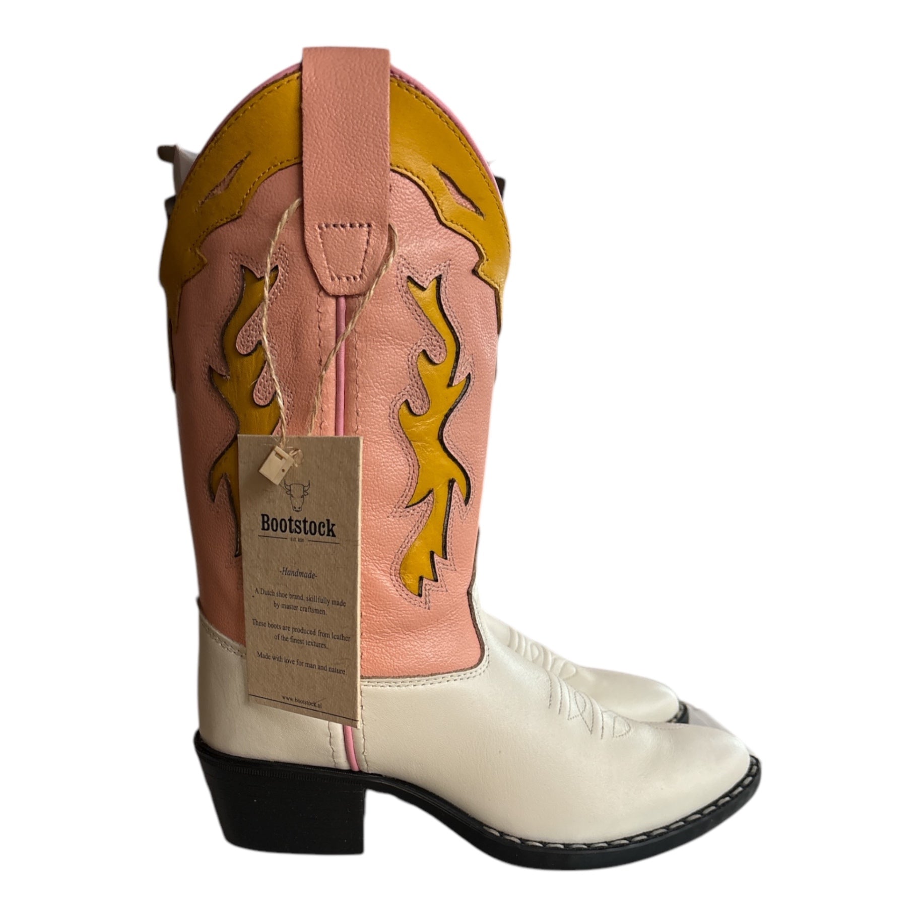 Step into Western flair with these eye-catching Bootstock cowboy boots. Featuring a playful combination of pink, yellow, and cream leather, they promise to uplift any outfit. Handcrafted with precision, the intricate design speaks to both quality and style. Whether paired with jeans or a flowing dress, they are your go-to for a standout look. The sturdy heel and sole ensure comfort and durability, making them perfect for all-day wear. Elevate your wardrobe with these lively leather boots. A trendy touch for the modern cowboy or cowgirl.