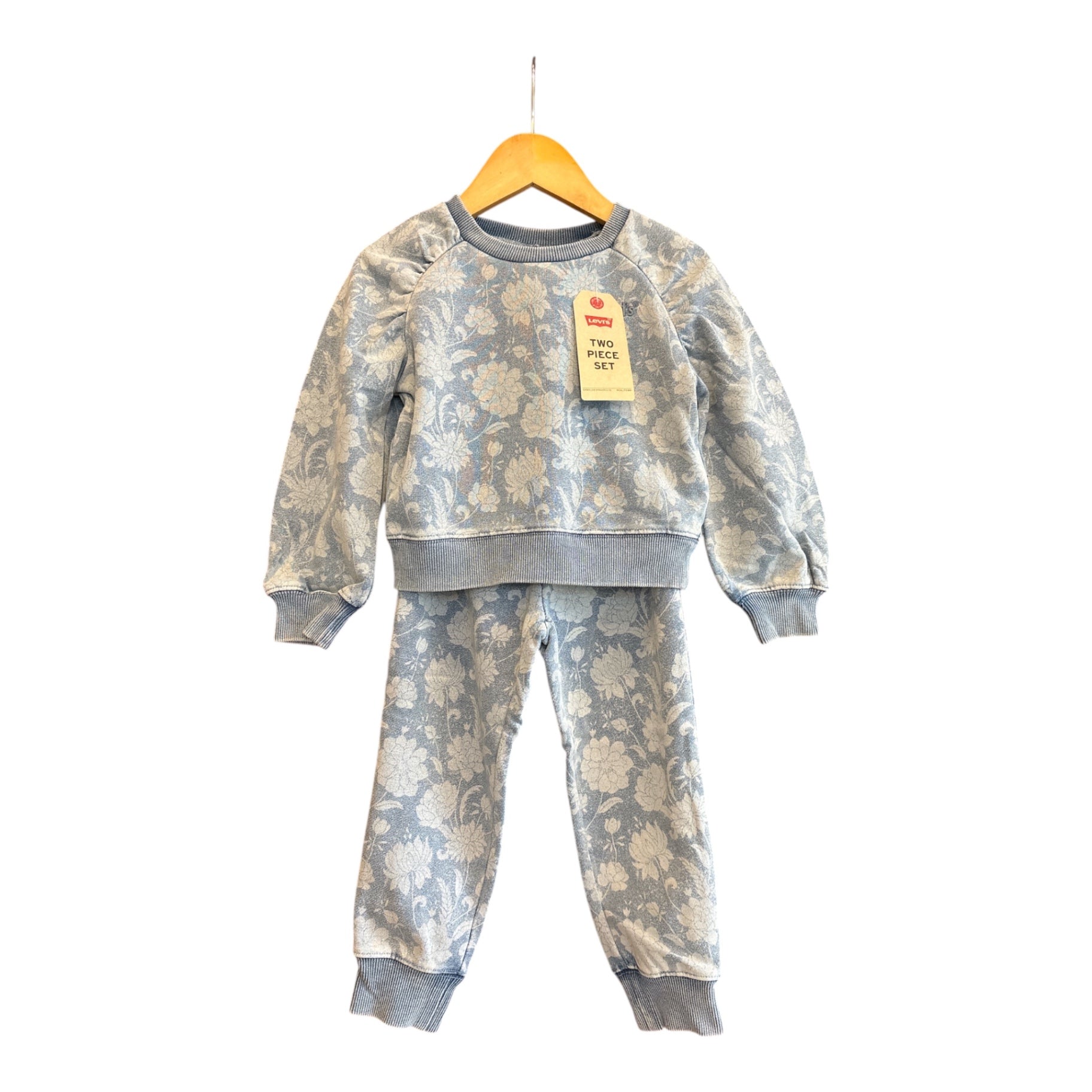 This adorable two-piece set from Levi’s is a staple for kids' wardrobes. The cozy sweatshirt and matching joggers feature a charming floral pattern in blue and white. Crafted from soft cotton, this outfit promises comfort and style for everyday adventures. Perfect for playdates or casual outings, its versatile design makes it easy to pair with other pieces. The elastic waistband ensures easy dressing, while the ribbed cuffs add a snug fit. Elevate your child's style effortlessly with this cute, comfy set.