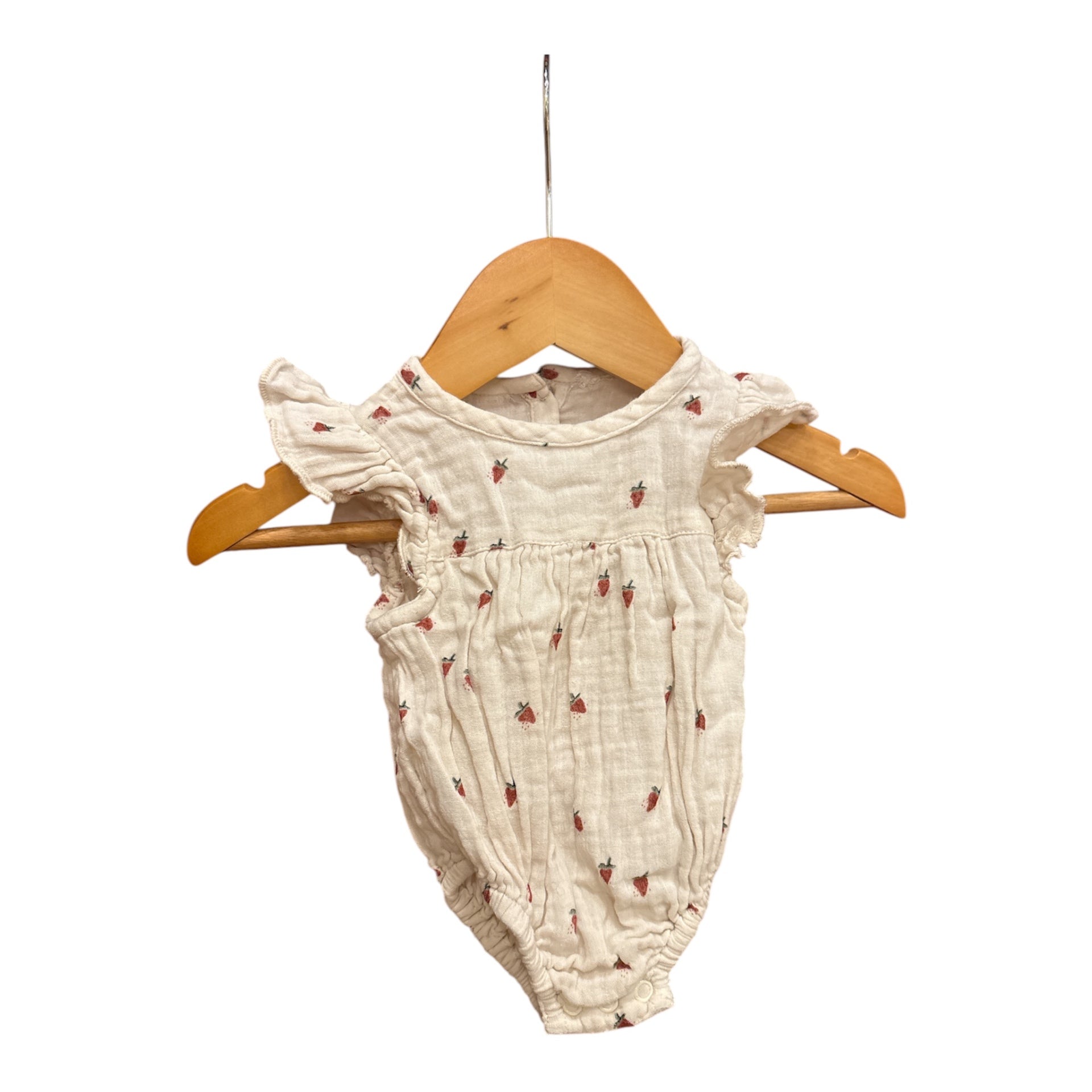 This adorable baby romper features a delightful strawberry print on a soft cream cotton. Perfect for warm days, the breathable fabric ensures comfort for little ones. Ruffled sleeves add a sweet touch, while the gathered waist provides a snug fit. Ideal for playdates and casual outings, this romper combines style with practicality. An essential piece for your baby’s wardrobe, it promises both cuteness and coziness.