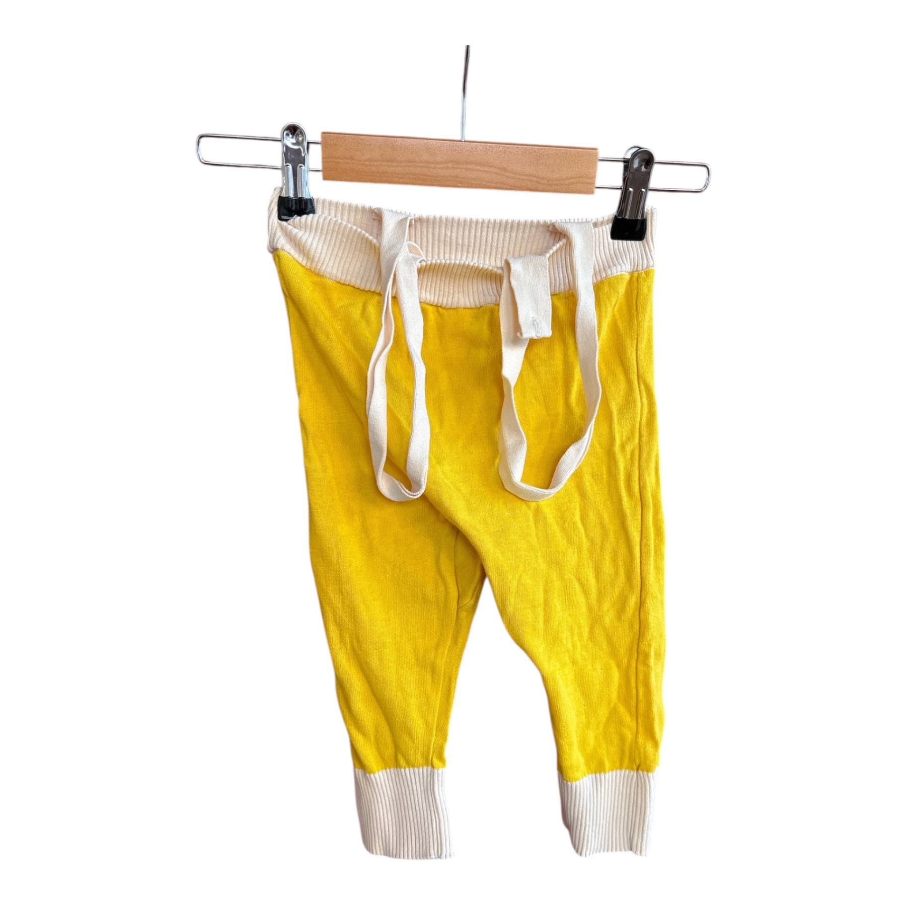Brighten up your toddler's wardrobe with these cheerful yellow pants. The ribbed white waistband and cuffs add a stylish contrast, ensuring a snug fit for active days. Crafted from soft cotton, they provide ultimate comfort for playtime indoors and out. These pants come with a charming tie detail, making them as cute as they are functional. Perfect for pairing with a cozy hoodie or a vibrant t-shirt, they offer versatility and style. A must-have for little ones with a sense of fun. Easy to wear and care for — simply a go-to favorite!