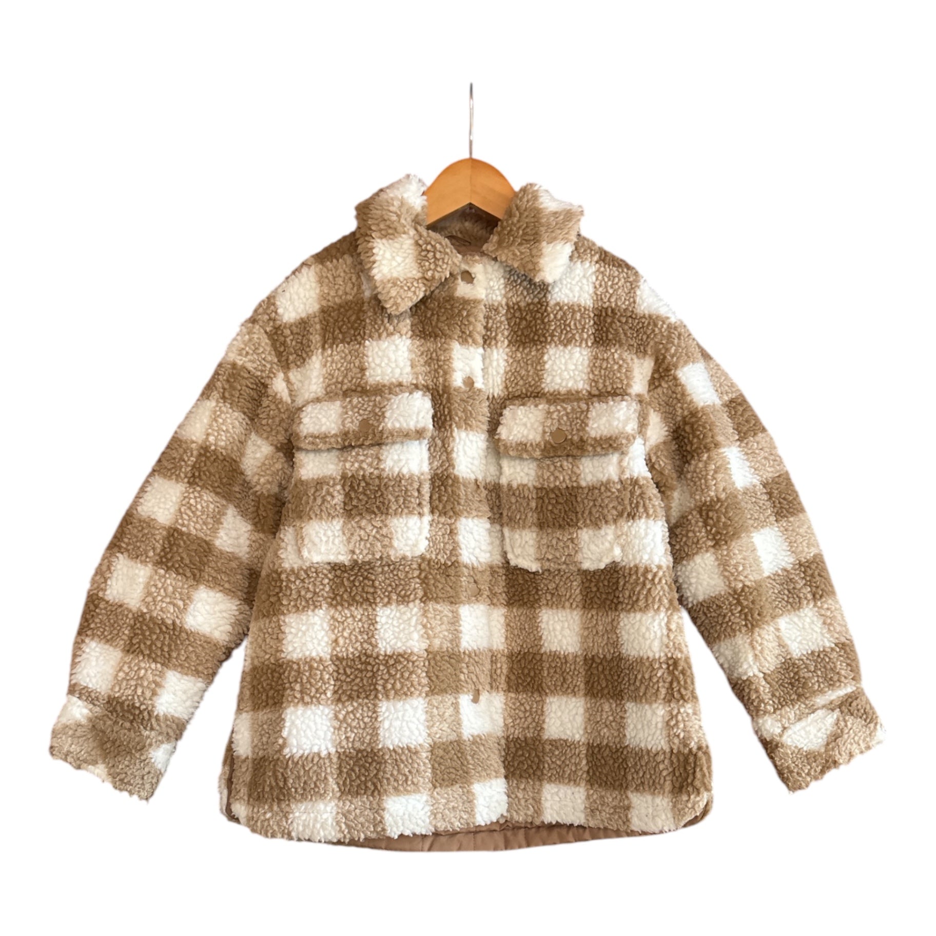 Wrap yourself in warmth and style with this cozy fleece jacket featuring a chic beige and white checkered design. The plush material promises comfort on cold days, while the fashionable pattern adds a touch of elegance to your wardrobe. Perfect for layering over casual outfits or adding a cozy flair to your evening ensemble. With its button-down pockets, it’s as functional as it is stylish. This jacket seamlessly marries functionality with fashion, making it a must-have for the season.